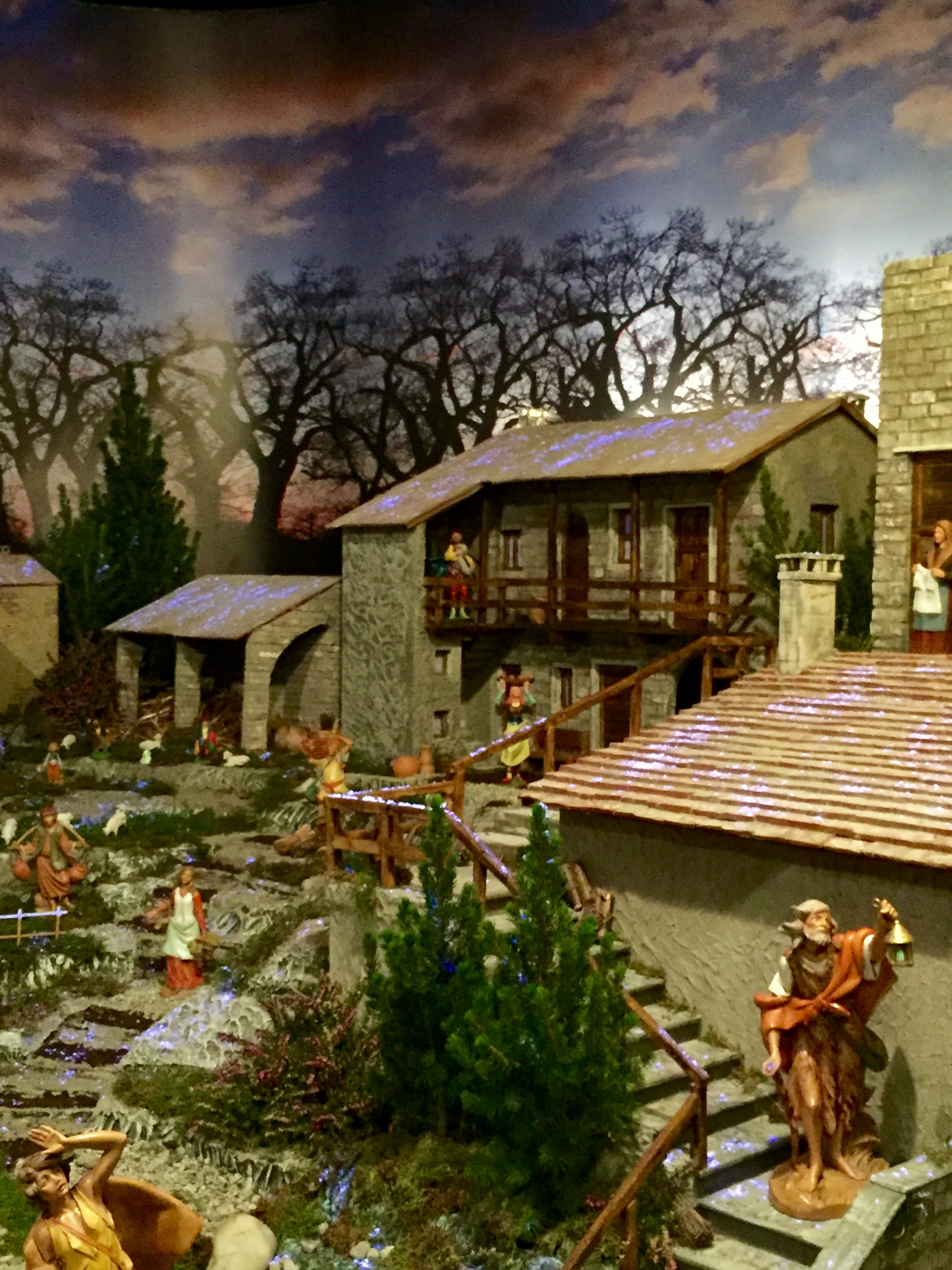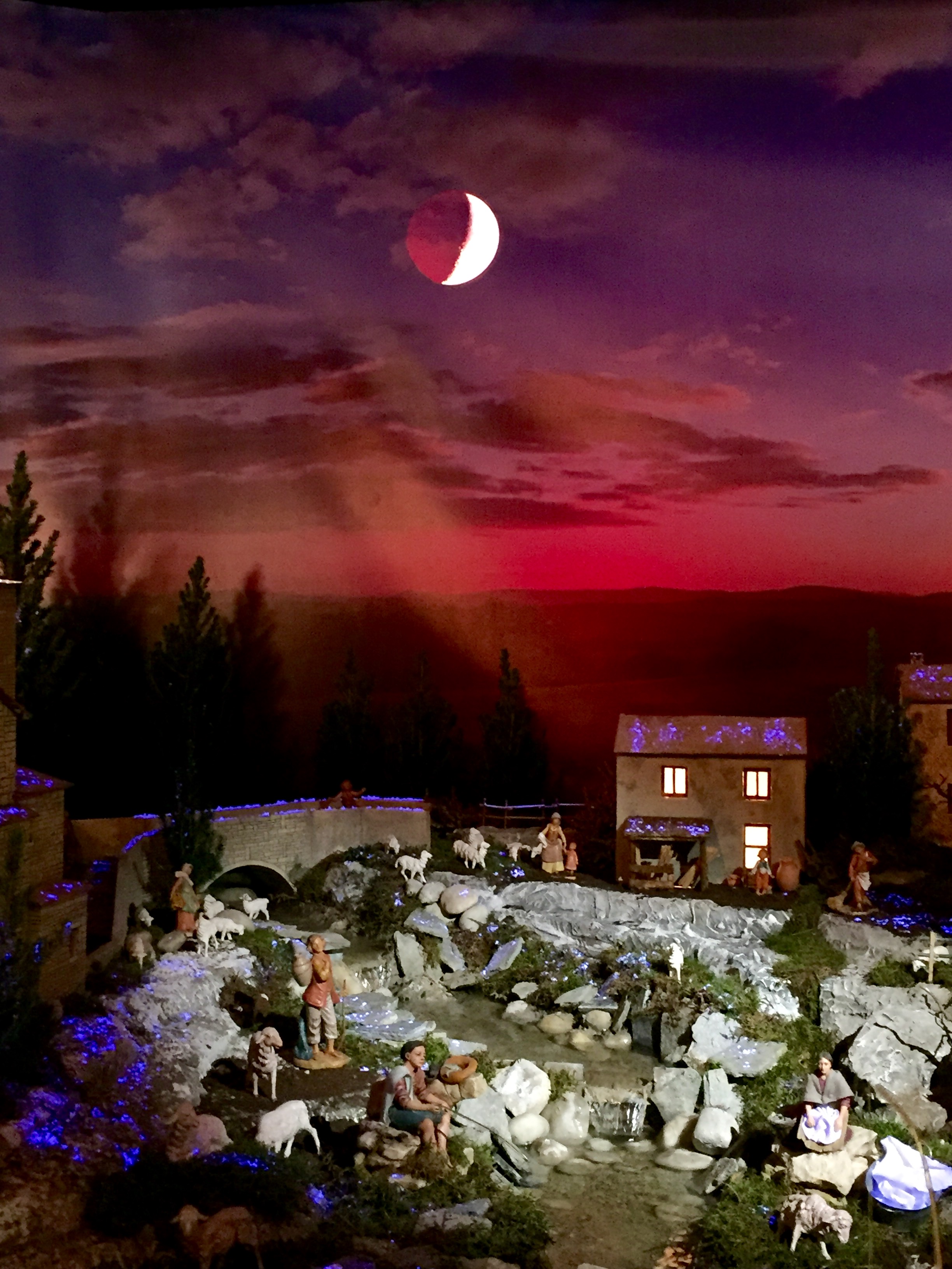 Anche nelle chiese e in tante case sono ritornati i presepi: luci dall’alba al tramonto, alla notte piena di stelle, i fuochi che sembrano veri con i pastori attorno che si scaldano, il ruscello che sfocia nel laghetto…