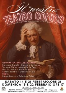 Il Gruppo Teatro Astrolabio quest’anno presenta una commedia trasformata in qualcosa di originale dove si comprende che il teatro vive con chi lo fa e con chi lo guarda: tra battute fulminanti e situazioni surreali, ritroverete un po’ di voi stessi nei sogni e nei guai dei nostri protagonisti. E ancora una volta si conferma che Goldoni è sempre attuale: la sua ironia attraversa i secoli e si fa specchio delle vanità, delle ambizioni e delle piccole follie che rendono il teatro unico.